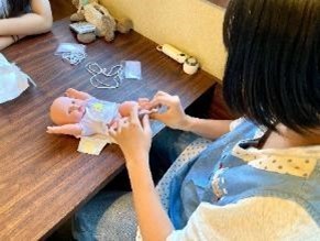 保育体験ではおむつ替えや折り紙製作、絵本読み聞かせを体験しました。