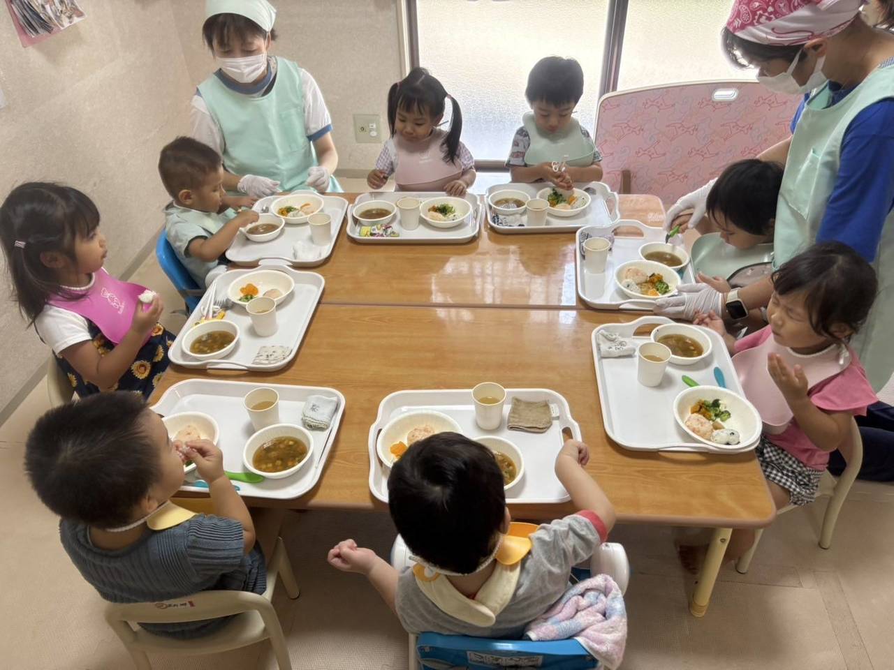 例えば9月は1日の防災の日を意識して、給食のお皿は全て紙皿で提供するという内容で保育を行いました。